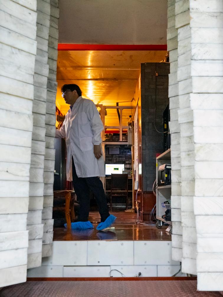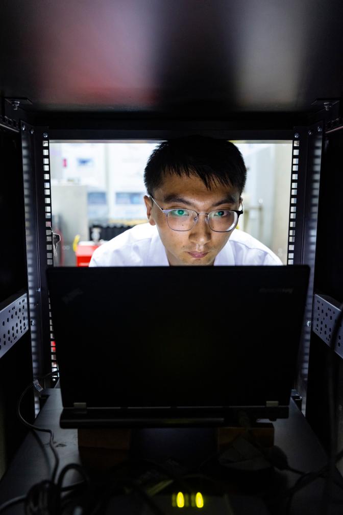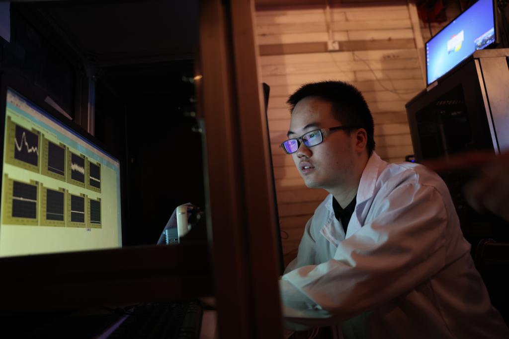 ↑7月3日,在中国锦屏地下实验室,清华大学牵头的中国暗物质实验(CDEX)合作组成员景明坤在检查实验数据。