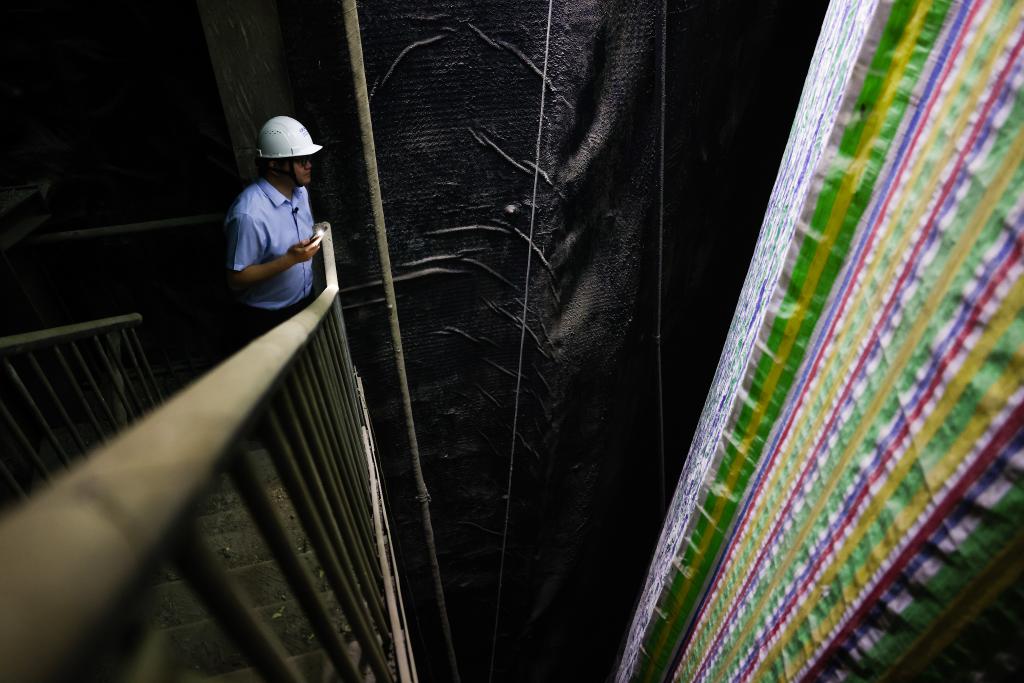 ↑7月4日,在中国锦屏地下实验室二期C1厅,杨丽桃博士在检查大型低温液氮屏蔽装置情况。这个大型低温液氮恒温器直径15米,高20米,液氮容积1725立方米,里面将能放置吨级高纯锗暗物质探测器进行实验。