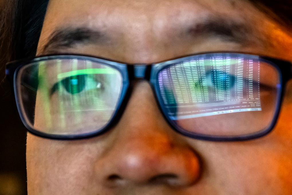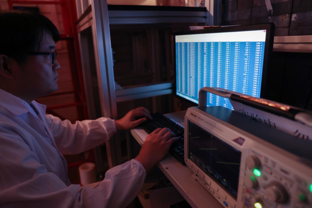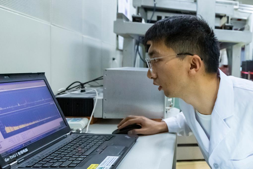 ↑7月3日,在中国锦屏地下实验室,清华大学牵头的中国暗物质实验(CDEX)合作组成员景明坤在查看实验数据。