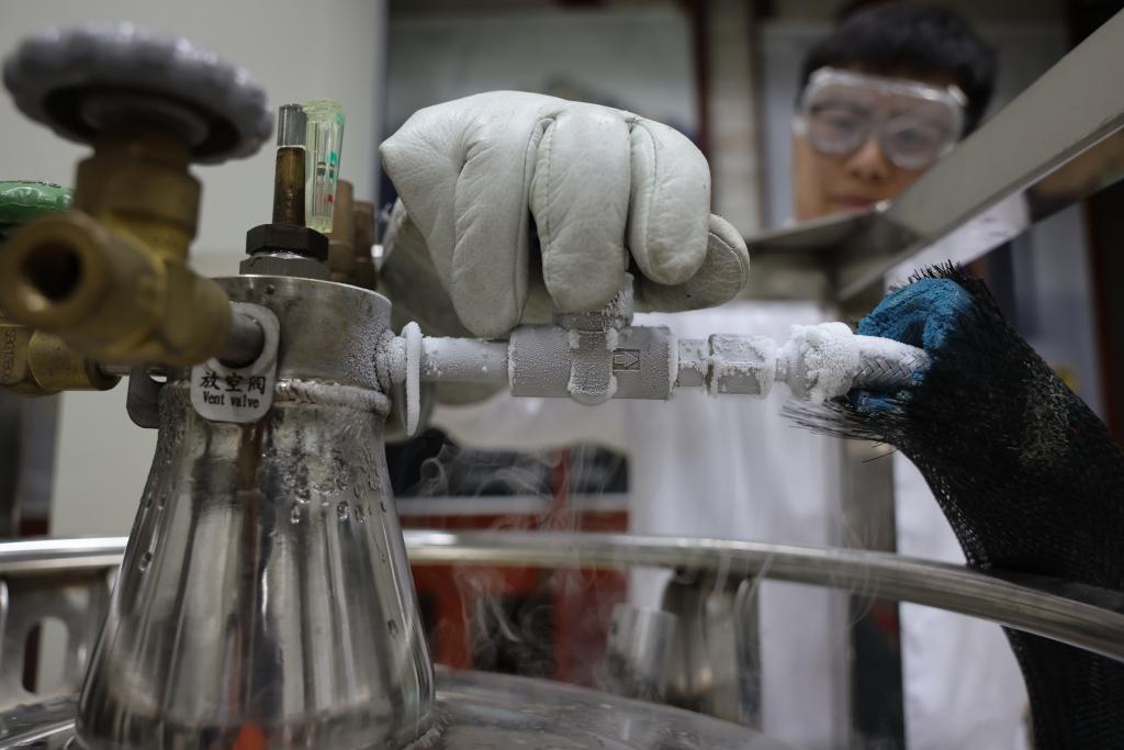 ↑7月3日,在中国锦屏地下实验室,清华大学牵头的中国暗物质实验(CDEX)合作组成员王钰锋将液氮灌入小型液氮罐中,为探测器测试做准备。