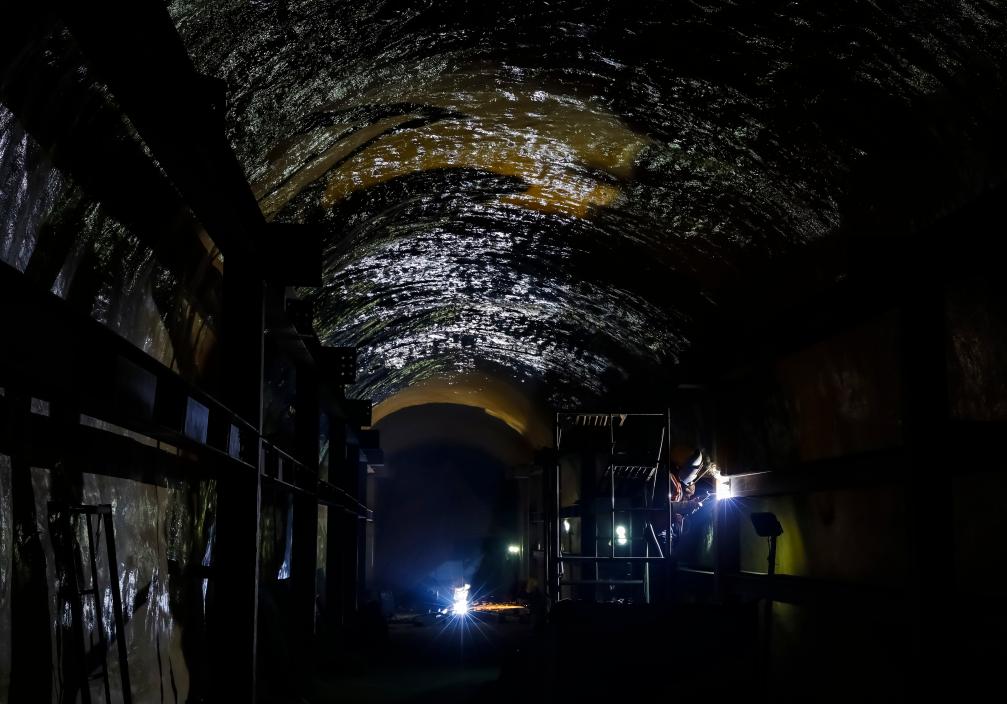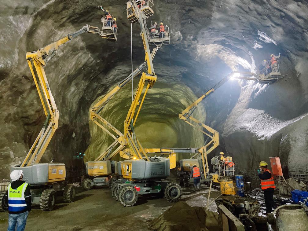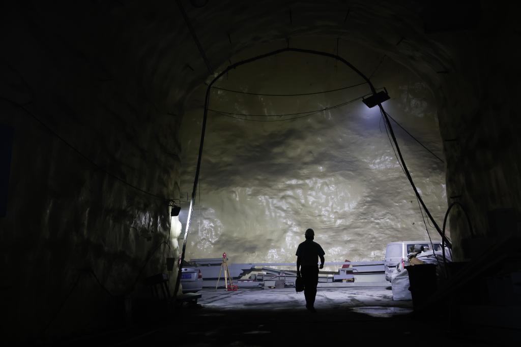 ↑2022年底,实施工程人员在中国锦屏地下实验室二期D2厅开展防水抑氡施工。该防水抑氡层有10厘米厚,可以有很大效果预防岩洞内地下水的渗透以及抑制岩层内的有害化学气体氡气扩散。