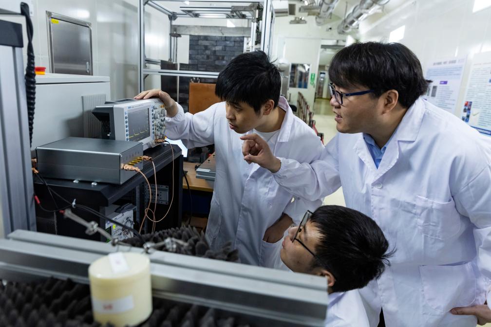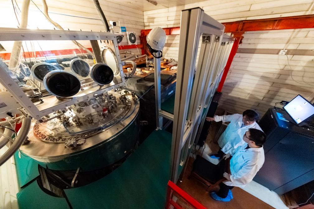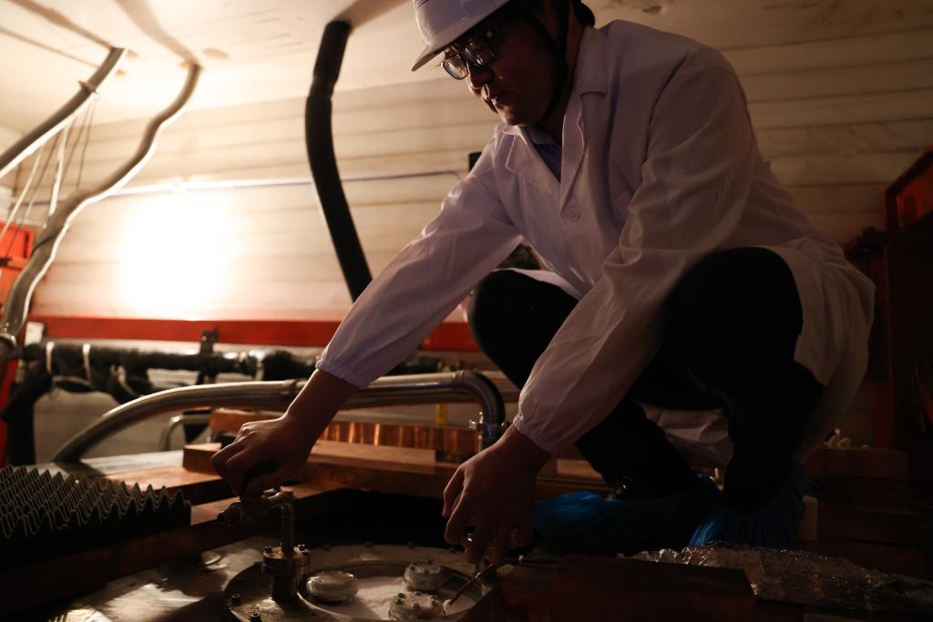 ↑7月3日,在中国锦屏地下实验室,清华大学牵头的中国暗物质实验(CDEX)合作组成员在开展面向第三代百公斤级高纯锗暗物质实验的新型高纯锗探测器测试。