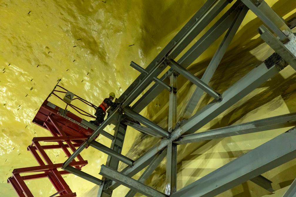 站在建设中的C1厅,记者看到顶部和周边岩壁的防水抑氡工程已完成,正在进行钢结构安装。据介绍,实验室C大厅宽14米、高14米、长130米,二期项目将形成4厅8室的整体格局,可利用实验空间超过30万立方米,可同时开展更多科学实验项目。除了暗物质探测实验研究以外,还将开展包括中微子物理、核天体物理、岩石力学等领域的研究。