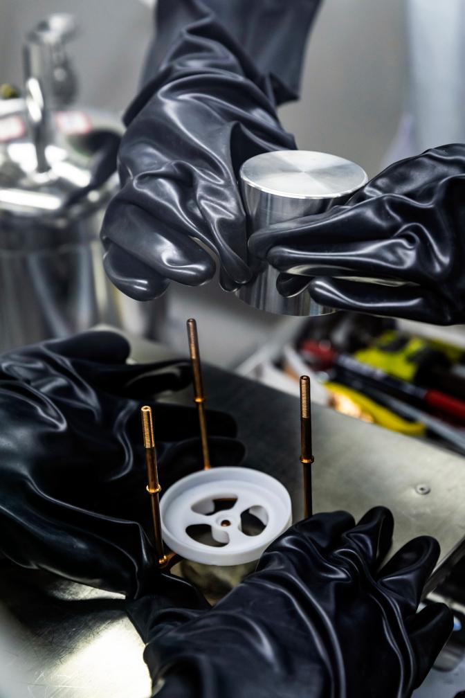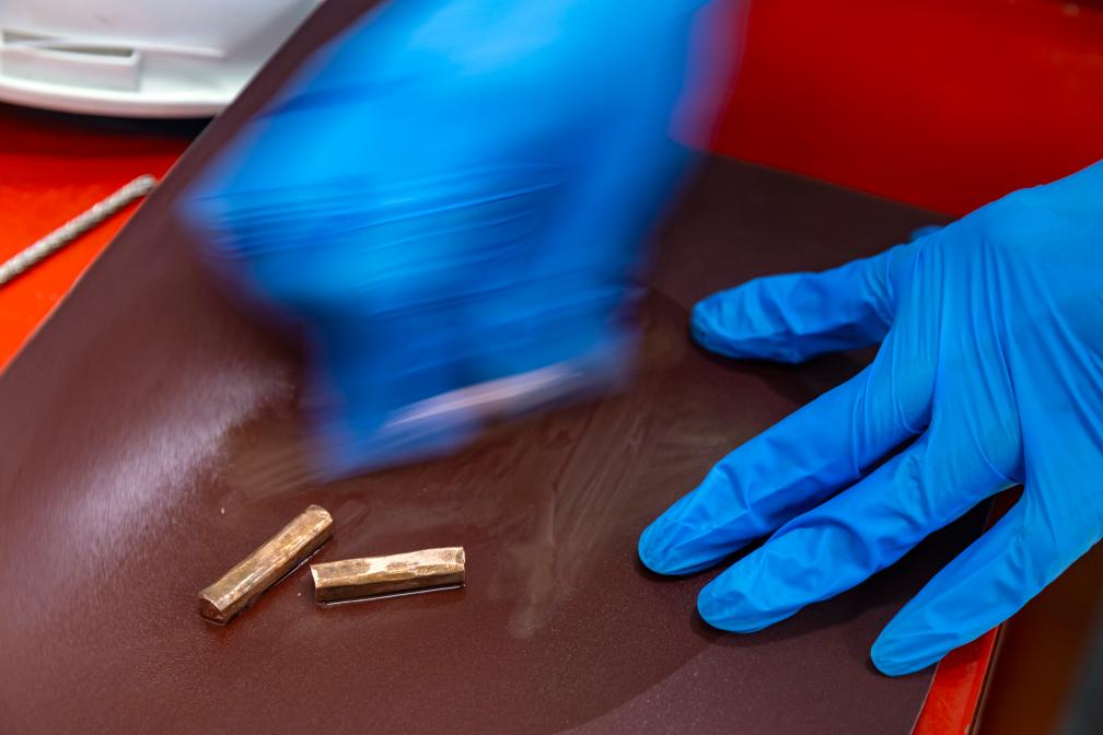 ↑7月3日,在中国锦屏地下实验室,清华大学牵头的中国暗物质实验(CDEX)合作组成员对准备采购的铜样品进行本底辐射检测,这是检测前打磨铜样品的氧化层。