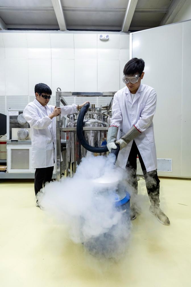 ↑7月3日,在中国锦屏地下实验室,清华大学牵头的中国暗物质实验(CDEX)合作组成员王钰锋(右)和梁艺帆将液氮灌入小型液氮罐中,为探测器测试做准备。