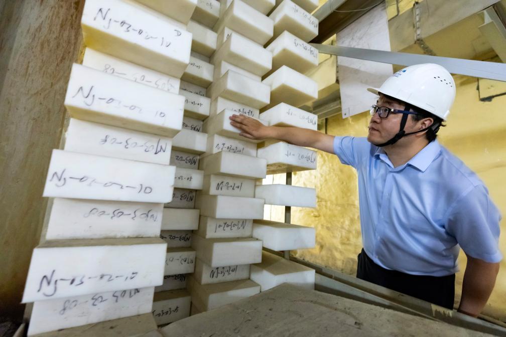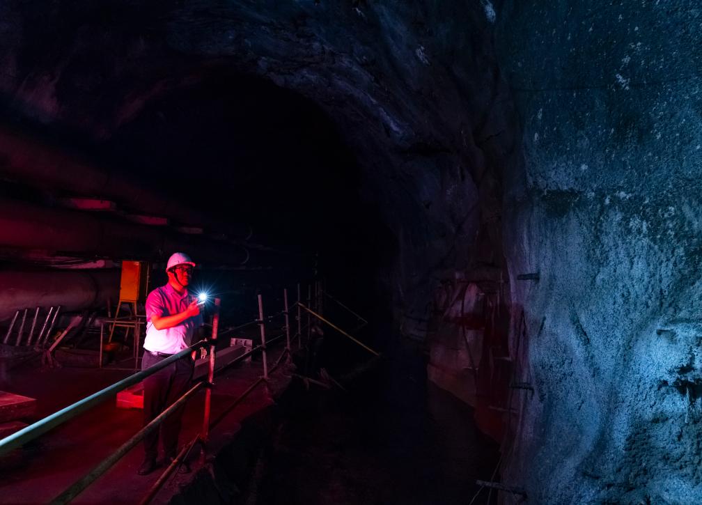 ↑7月4日,在中国锦屏地下实验室二期C2厅,杨丽桃博士在检查组合式固体辐射屏蔽装置中聚乙烯屏蔽舱的建设进展情况。该聚乙烯屏蔽舱由多层不规则排列的聚乙烯块构成,可以轻松又有效屏蔽周围环境的中子本底干扰。